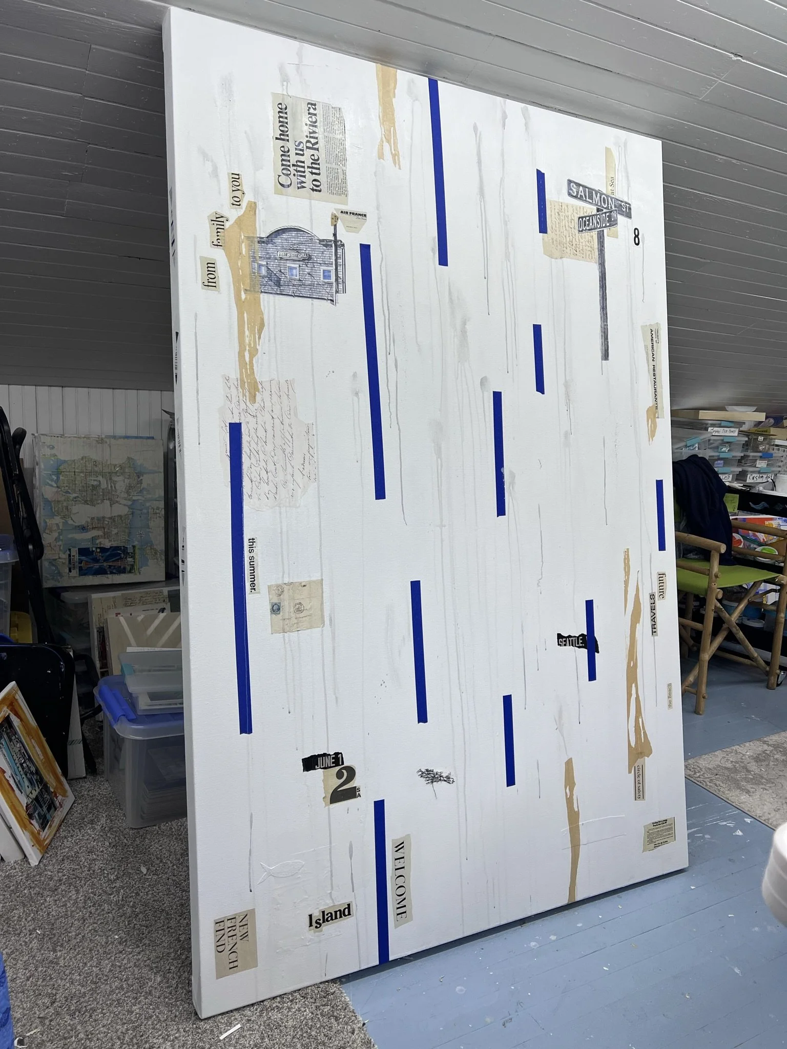 The largest painting is 4 foot by 6 foot art commission. That size of canvas was challenge in addition to creating the painting in primarily black and white…when I typically use so much color. She also had the awesome idea to create the art with the seafood shack together with the cool, rustic boat.
